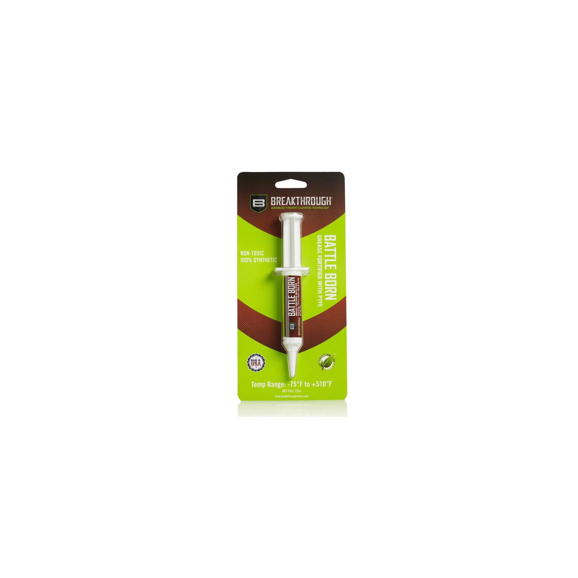 Graisse de haute qualité en seringue de 12 cc pour lubrifier et protéger l'armement et ses composants. Une graisse de haute qualité fortifié PTFE qui protège contre la corrosion et la rouille en assurant une protection maximale des armes à feu dans des températures extrêmement élevées et basses. Les produits de nettoyage Breakthrough® Clean sont à la pointe de la technologie et permettent un nettoyage plus rapide et plus sûr de vos armes à feu.