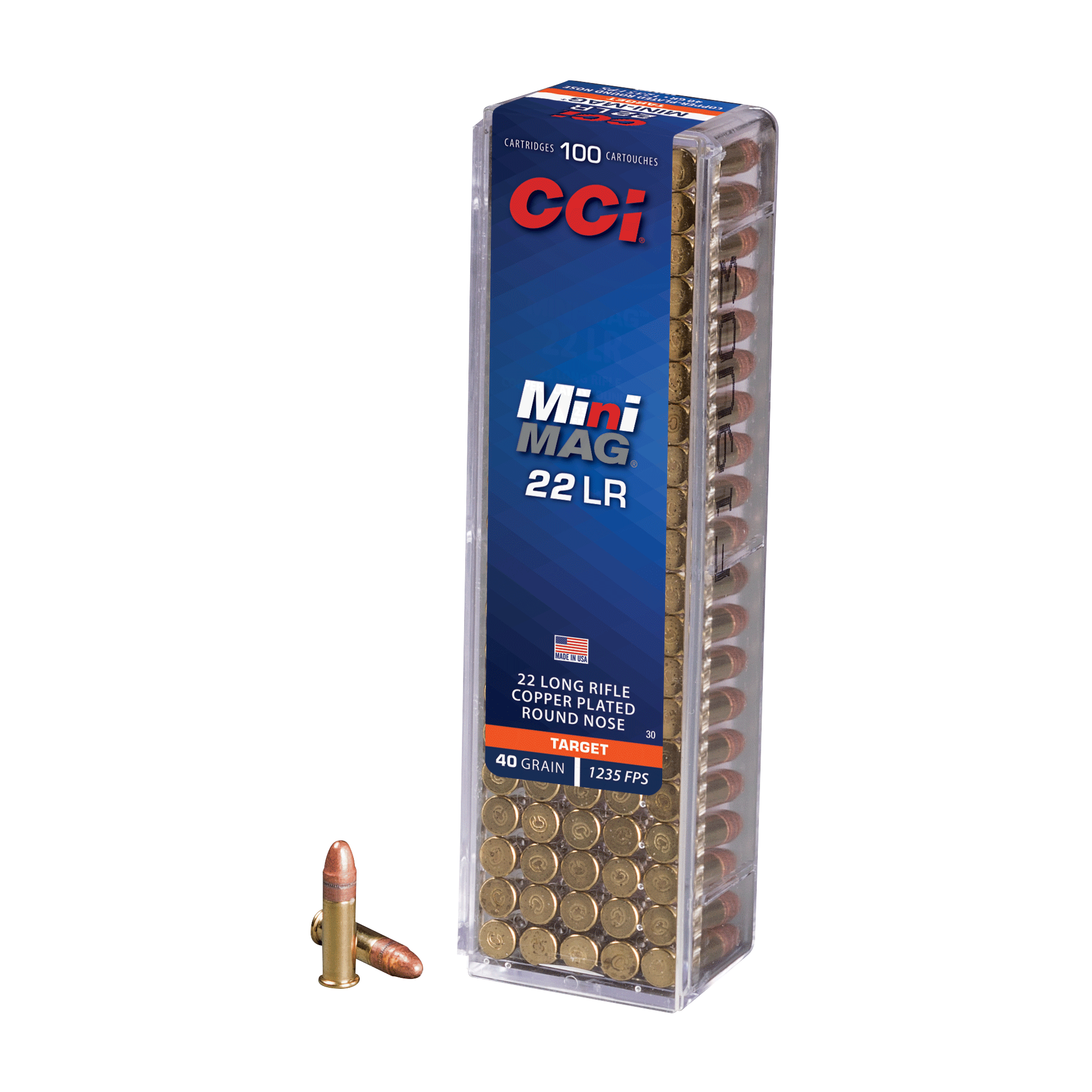 Boite de 100 cartouches CCI MINIMAG en calibre 22LR de 40 grains cuivré.